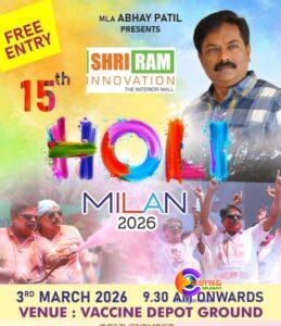 बेळगाव दक्षिणमध्ये आमदार अभय पाटील यांच्या १५व्या ‘होळी मिलन’ सोहळ्यासाठी जोरदार तयारी रंगांमध्ये राजकारणापेक्षा अधिक सौहार्द – हजारोंच्या उपस्थितीत भव्य मेळावा. पंधरा वर्षांची परंपरा… ऐक्याचे प्रतीक बनत वाढणारे होळी मिलन. युवाशक्ती, संगीत, गोडधोड वाटप – मतदारसंघात उत्सवाची धूम सामाजिक बंध अधिक दृढ करणाऱ्या उत्सवासाठी भव्य तयारी पक्षभेद विसरून जनतेला एकाच व्यासपीठावर आणणारा रंगोत्सव बेळगाव :…