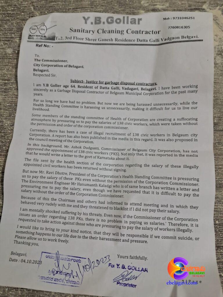 ಬೆಳಗಾವಿ ಮಹಾನಗರ ಪಾಲಿಕೆ ಇತುಹಾಸದಲ್ಲಿಯೇ ಮೊಟ್ಟ ಮೊದಲಬಾರಿಗೆ ಸ್ವಚ್ಚತಾ ಗುತ್ತಿಗೆದಾರ ರೊಬ್ವರು ಬಹಿರಂಗವಾಗಿ ಪತ್ರ ಬರೆದು ತಮ್ಮ ಅಳಲನ್ನು ತೋಡಿಕೊಂಡಿದ್ದಾರೆ.