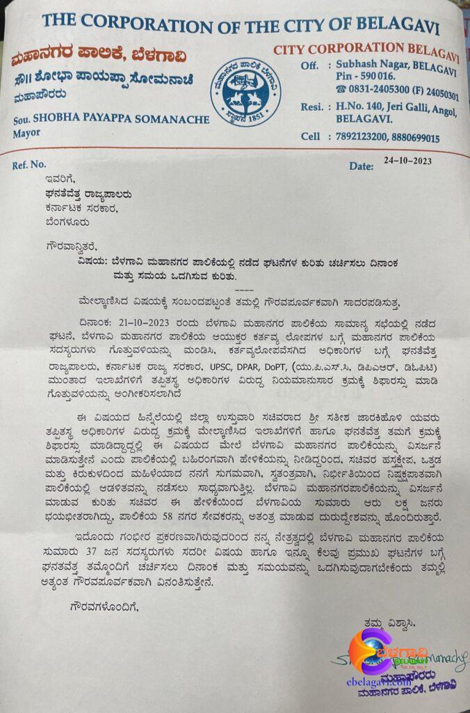 ಬೆಳಗಾವಿ. ಪಾಲಿಕೆ ರಾಜಕಾರಣ ವಿಕೋಪಕ್ಕೆ ಹೋಗುತ್ತಿದ್ದ ಸಂದರ್ಭದಲ್ಲಿಯೇ ಮೇಯರ್ ಶೋಭಾ ಸೋಮನ್ನಾಚೆ ರಾಜ್ಯಪಾಲರಿಗೆ ಪತ್ರ ಬರೆದಿದ್ದು ಚರ್ಚೆಗೆ ಎಡೆ ಮಾಡಿಕೊಟ್ಟಿದೆ.