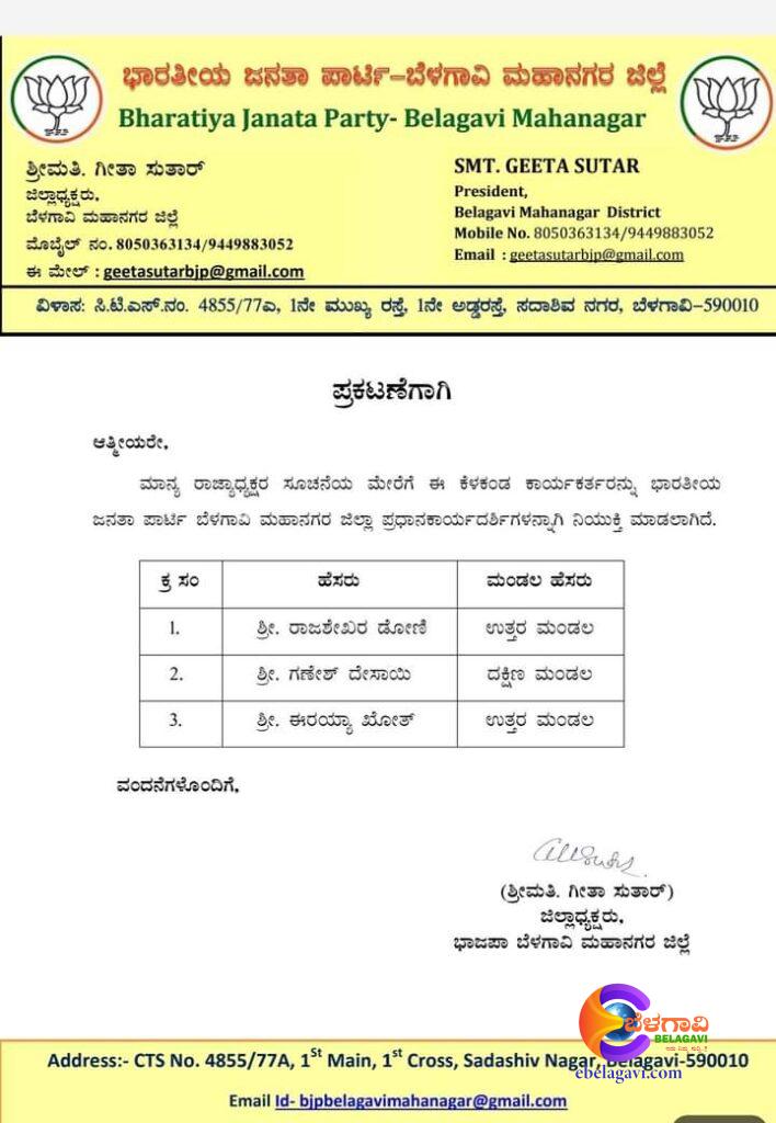 ರಾಜ್ಯಾಧ್ಯಕ್ಷರ ಸೂಚನೆ ಮೇರೆಗೆ ಉತ್ತರ ಮಂಡಲಕ್ಕೆ ರಾಜಶೇಖರ ಡೋಣಿ, ಈರಯ್ಯಾ ಖೋತ ಮತ್ತು ದಕ್ಷಿಣ ಮಂಡಲಕ್ಕೆ ಗಣೇಶ ದೇಸಾಯಿ ಅವರನ್ನು ನೇಮಕ ಮಾಡಲಾಗಿದೆ.ಮಹಾನಗರ ಅಧ್ಯಕ್ಷೆ ಗೀತಾ ಸುತಾರ ಈ ಆದೇಶ ಮಾಡಿದ್ದಾರೆ.
