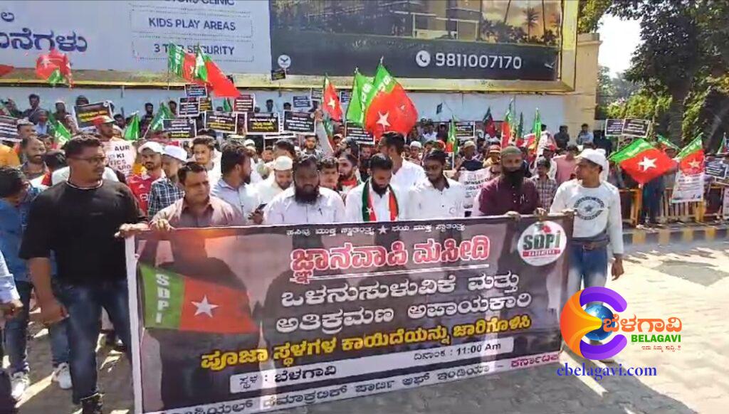 ಉತ್ತರ ಪ್ರದೇಶದ ಗ್ಯಾನವಾಪಿ ಮಸೀದಿಯ ನೆಲಮಹಡಿಯಲ್ಲಿ ಪೂಜೆಗೆ ಅವಕಾಶ ಮಾಡಿ ಕೊಟ್ಟಿದ್ದುನ್ನು ಖಂಡಿಸಿ ಗುರುವಾರ ನಗರದ ಚನ್ನಮ್ಮ ವೃತ್ತದಲ್ಲಿ ಬೆಳಗಾವಿಯ ಸೋಶಿಯಲ್ ಡೆಮೊಕ್ರೆಟಿಕ್ ಪಾರ್ಟಿ ಆಫ್ ಇಂಡಿಯಾ ವತಿಯಿಂದ ಪ್ರತಿಭಟನೆ ನಡೆಸಲಾಯಿತು.