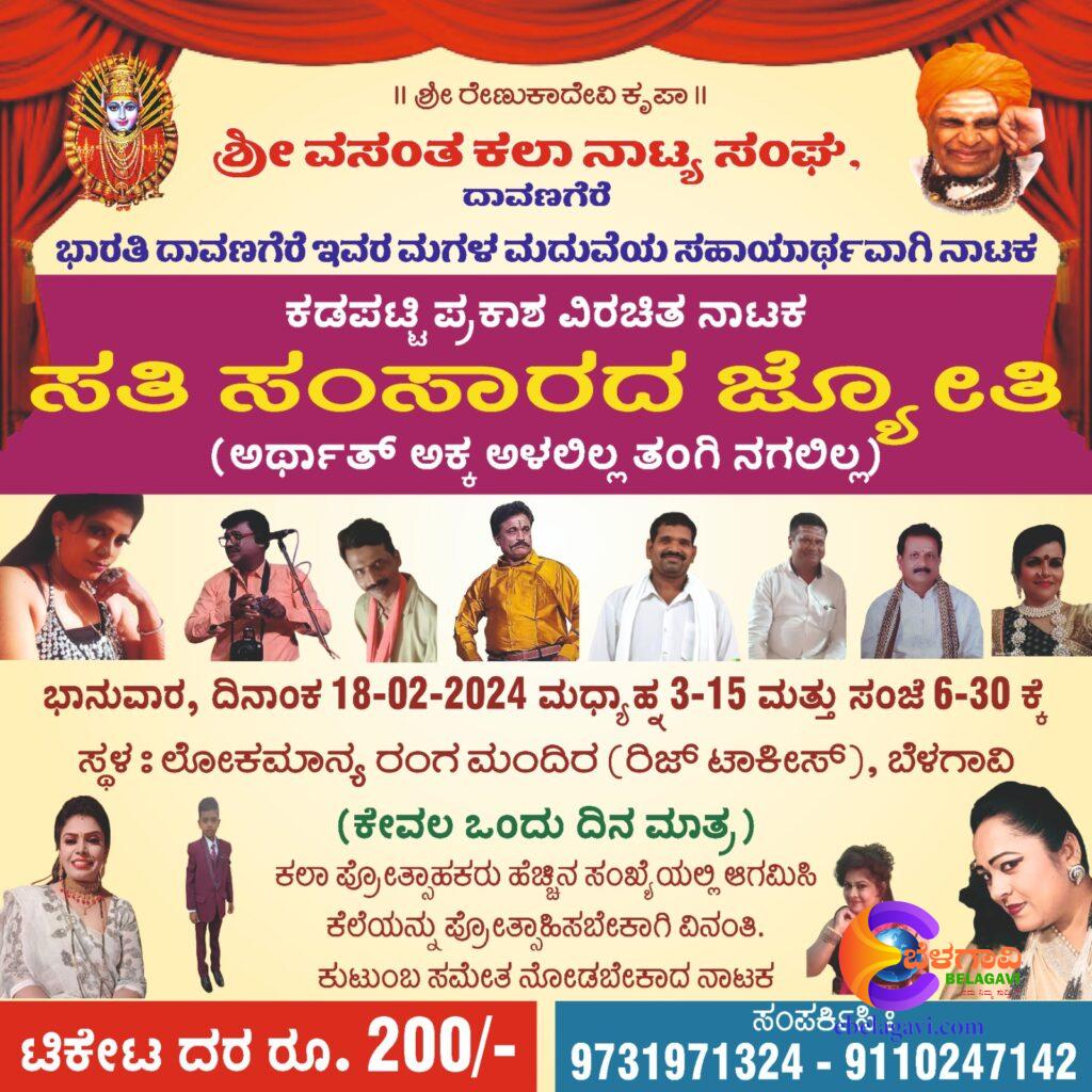 ಬೆಳಗಾವಿಯ ಲೋಕಮಾನ್ಯ ರಂಗಮಂದಿರದಲ್ಲಿ ಇದೇ ದಿ. 18 ರಂದು ವಸಂತ ಕಲಾ ನಾಟ್ಯ ಸಂಘದ ಶ್ರೀಮತಿ ಭಾರತಿ ಎಂಬುವರು ತಮ್ಮ ಮಗಳ ಮದುವೆ ಸಹಾಯಾರ್ಥ ಸತಿ ಸಂಸಾರದ ಜ್ಯೋತಿ ಎನ್ನುವ ಕನ್ನಡ ನಾಟಕ ಪ್ರದರ್ಶನಕ್ಕೆ ಮುಂದಾಗಿದ್ದರು,