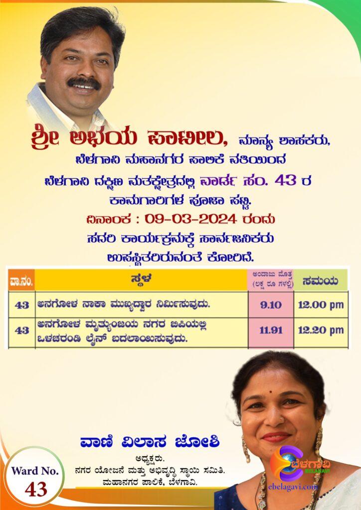 ವಾರ್ಡ ನಂಬರ 43 ರಲ್ಲಿ ಬರುವ ಅನಗೋಳ ನಾಕಾದಲ್ಲಿ ಸುಮಾರು 9 ಲಕ್ಷ ರೂ ಮೊತ್ತದ ಕಮಾನ್ ನಿರ್ಮಾಣ ಕಾಮಗಾರಿಗೆ ಮದ್ಯಾಹ್ನ 12 ಕ್ಕೆ ಶಾಸಕ ಅಭಯ ಪಾಟೀಲರು ಚಾಲನೆ ನೀಡುವರು.