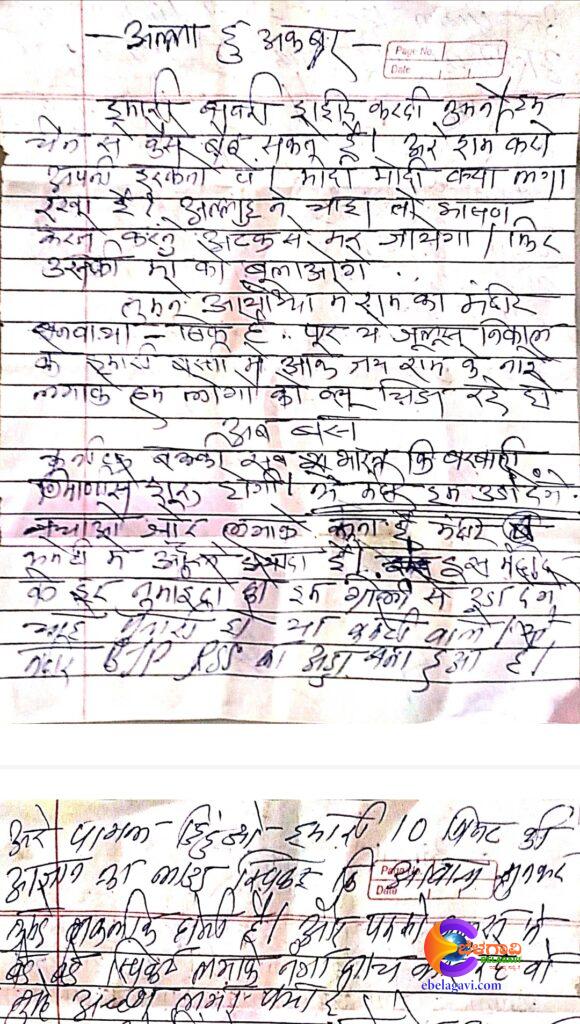 :ನಿಮ್ಮ ರಾಮ ಮಂದಿರ ಸ್ಪೋಟಿಸುತ್ತೇವೆ, ಸುಧಾರಿಸಿಕೊಳ್ಳಿ* ಅದನ್ನು ದೊಡ್ಡ ಪ್ರಮಾಣದಲ್ಲಿ ಸ್ಫಟಿಸುತ್ತೇವೆ. ಎಂದು ಬೆದರಿಕರಬಹಾಕಿದ್ದಲ್ಕದೆ ಆ ಪತ್ರದ ಮೇಲೆ ಅಲ್ಲಾಹು ಅಕ್ಬರ್ ಎಂದು ಬರೆಯಲಾಗಿದೆ.