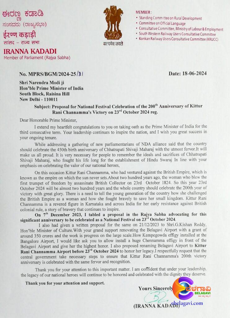 ಈ ಹಿನ್ನೆಲೆಯಲ್ಲಿ 200 ವರ್ಷದ ಚನ್ನಮ್ಮನ ವಿಜಯೋತ್ಸವವನ್ನು ಅದ್ದೂರಿಯಾಗಿ ಆಚರಿಸಬೇಕೆಂಬ ಉದ್ದೇಶದಿಂದ ಪ್ರಧಾನಿ ನರೇಂದ್ರ ಮೋದಿಯವರಿಗೆ ಪತ್ರವನ್ನು ಬರೆದಿದ್ದೇನೆ ಎಂದು ರಾಜ್ಯಸಭಾ ಸದಸ್ಯ ಕಡಾಡಿ ಹೇಳಿದರು,