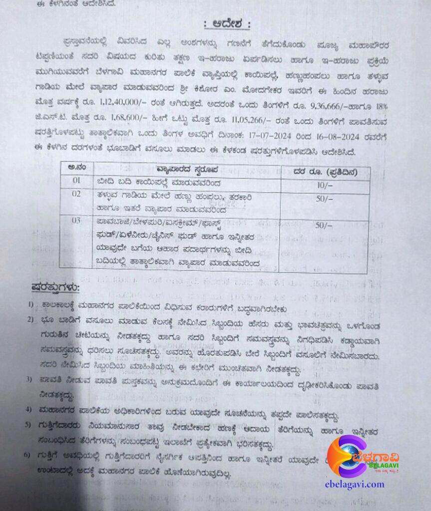 ಬೆಳಗಾವಿ ಮಹಾನಗರ ಪಾಲಿಕೆ ವ್ಯಾಪ್ತಿಯಲ್ಲಿ ಕಾಯಿಪಲ್ಲೆ, ಹಣ್ಣು ಹಂಪಲು ಮತ್ತು ತಳ್ಳುವ ಗಾಡಿ ಮೇಲೆ ವ್ಯಾಪಾರ ಮಾಡುವವರದಿಂದ ಭೂ ಬಾಡಿಗೆ ವಸೂಲಿ ಮಾಡಲು ಗುತ್ತಿಗೆಯನ್ನು ನೀಡಲಾಗುತ್ತದೆ.
