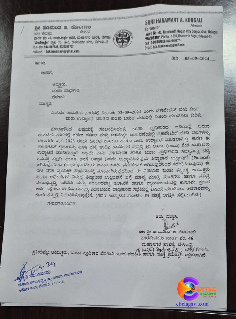उद्घाटन कार्यक्रमाला निमंत्रित न केल्याची त्यांची तक्रार आहे. कोंगाळी हे बेळगाव नगर विकास प्राधिकरण तथा बुडाचे नामनिर्देशित सदस्यही आहेत. कोंगाळी यांच्याच प्रभागात पथदिपांचा उद्घाटन कार्यक्रम झाला. त्यामुळे त्या हनुमंता कोंगाळी यांना निमंत्रित केले जाणे आवश्यक होते.