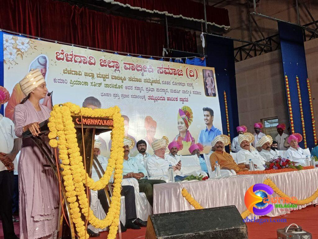 ನಗರದ ಕುಮಾರ ಗಂಧರ್ವ ಕಲಾಮಂದಿರದಲ್ಲಿ‌ ಭಾನುವಾರ ಬೆಳಗಾವಿ ಜಿಲ್ಲೆ ವಾಲ್ಮೀಕಿ ಸಮಾಜ ವತಿಯಿಂದ ಆಯೋಜಿಸಿದ್ದ ಜಿಲ್ಲಾ ಮಟ್ಟದ ವಾಲ್ಮೀಕಿ ಸಮಾಜದ ಸಮ್ಮೇಳನ ಹಾಗೂ ಪ್ರತಿಭಾ ಪುರಸ್ಕಾರ ಕಾರ್ಯಕ್ರಮದಲ್ಲಿ ನೂತನ ಲೋಕಸಭಾ ಸದಸ್ಯೆ ಪ್ರಿಯಂಕಾ ಜಾರಕಿಹೊಳಿ ಅವರು ಸನ್ಮಾನ ಸ್ವೀಕರಿಸಿ ಅವರು ಮಾತನಾಡಿದರು.
