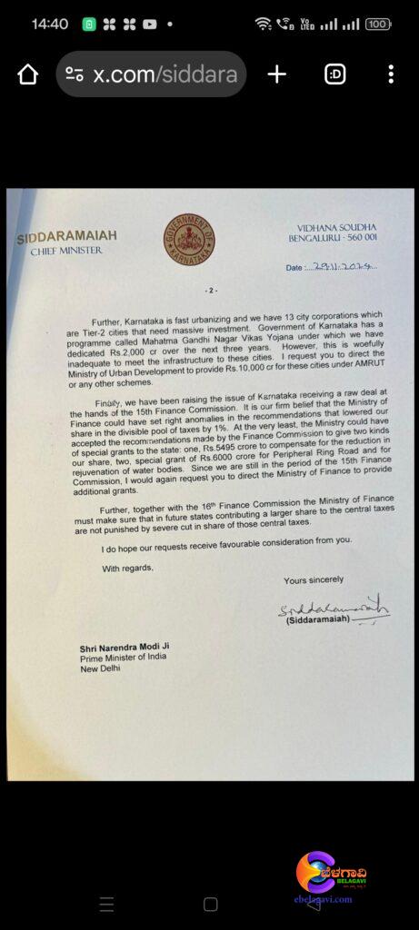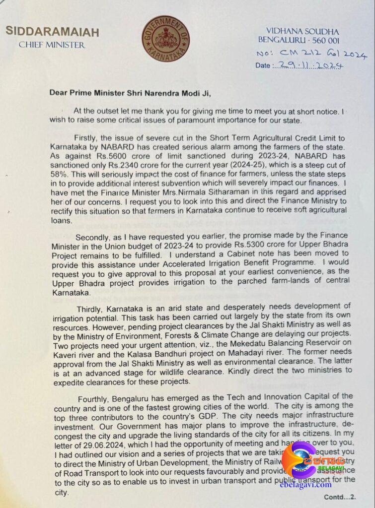 Chief Minister Siddaramaiah, who met with the Prime Minister in Delhi, submitted a memorandum outlining several issues of concern to the state, including increasing the amount of NABARD loans to farmers, grants for the Bhadra Upper Drainage Project, approval for the Mekedatu and Kalasa-Banduri projects, and the allocation of a fair tax share to the state in the 16th Finance Commission.