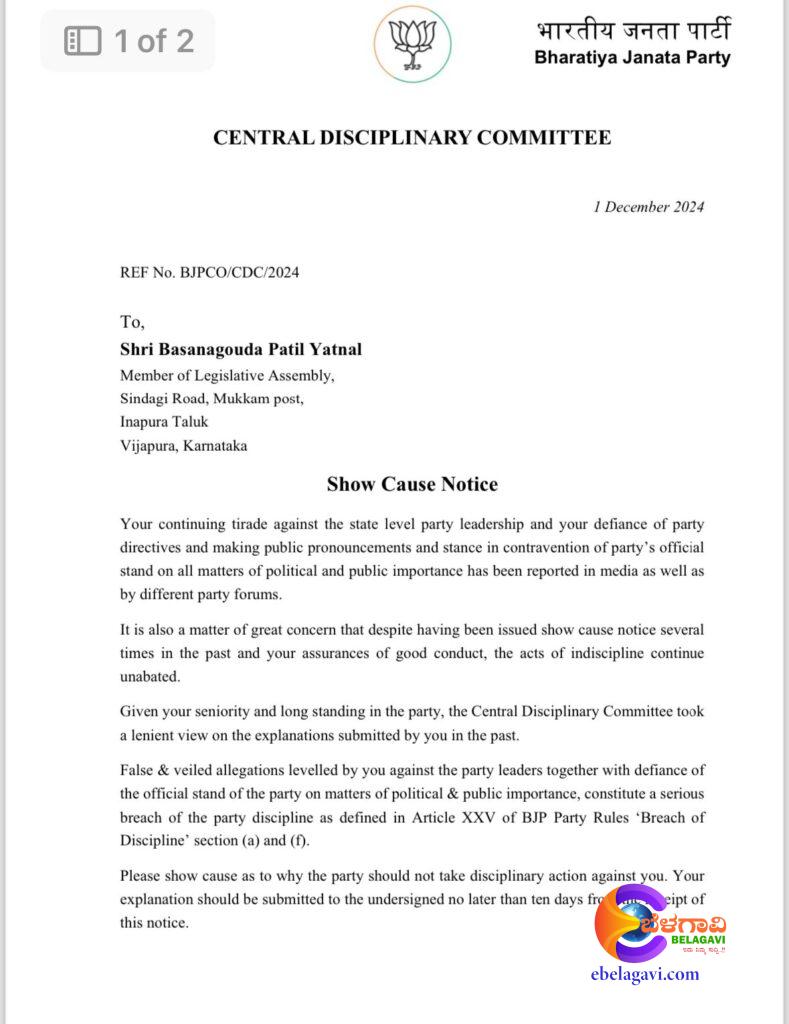 ಬಿಜೆಪಿ ರಾಷ್ಟ್ರೀಯ ಶಿಸ್ತು ಸಮಿತಿ “ಶೋಕಾಸ್ ನೋಟಿಸ್” ಜಾರಿ ಮಾಡಿದೆ.