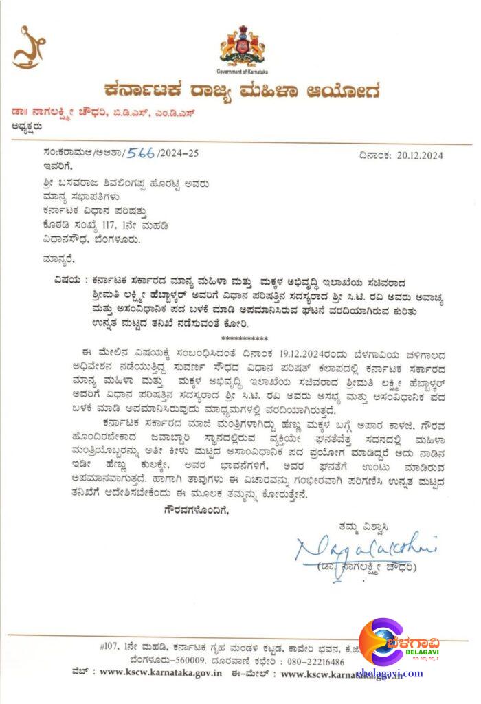 ಬೆಳಗಾವಿ. ಮಹಿಳಾ ಮತ್ತು ಮಕ್ಕಳ ಕಲ್ಯಾಣ ಸಚಿವೆ ಶ್ರೀಮತಿ ಲಕ್ಷ್ಮೀ ಹೆಬ್ಬಾಳಕರ ವಿರುದ್ಧ ಬಿಜೆಪಿಯ ವಿಧಾನ ಪರಿಷತ್ ಸದಸ್ಯ ಸಿ.ಟಿ.ರವಿ ಬಳಸಿದ ಅಸಂವಿಧಾನಿಕ ಪದದ ಬಗ್ಗೆ ಸಮಗ್ರ ತನಿಖೆ ನಡೆಸಬೇಕೆಂದು ಮಹಿಳಾ ಆಯೋಗದ ಅಧ್ಯಕ್ಷೆ ನಾಗಲಕ್ಷ್ಮೀ ಅವರು ಸಭಾಪತಿಯವರಿಗೆ ಮನವಿ ಮಾಡಿದ್ದಾರೆ.