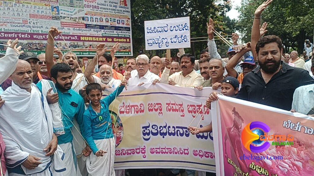 कित्तूर चन्नम्मा चौकात एकत्र जमलेल्या ब्राह्मण समाजाच्या लोकांनी जनेऊ कापून विटंबना करणाऱ्यांविरोधात तीव्र संताप व्यक्त केला.