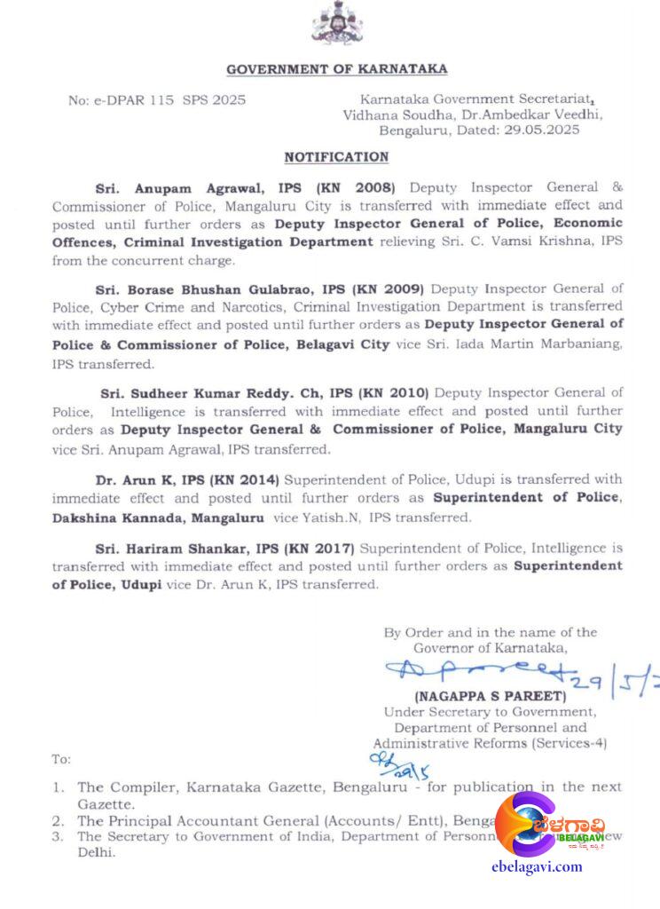 ಅದೇ ರೀತಿ IPS ಗಳಾದ ಅನುಪಮ ಅಗರವಾಲ್ ಸುಧೀರ್ ಕುಮಾರ ರೆಡ್ಡಿ, ಅರುಣ ಕೆ ಮತ್ತು ಹರಿರಾಮ ಶಂಕರ್ ಅವರನ್ನು ವರ್ಗಾವಣೆ ಮಾಡಲಾಗಿದೆ. ಆದರೆ ಮಾರ್ಬನ್ಯಾಂಗ್ ಅವರಿಗೆ ಬೇರೆ ಜಾಗೆ ತೋರಿಸಿಲ್ಲ.