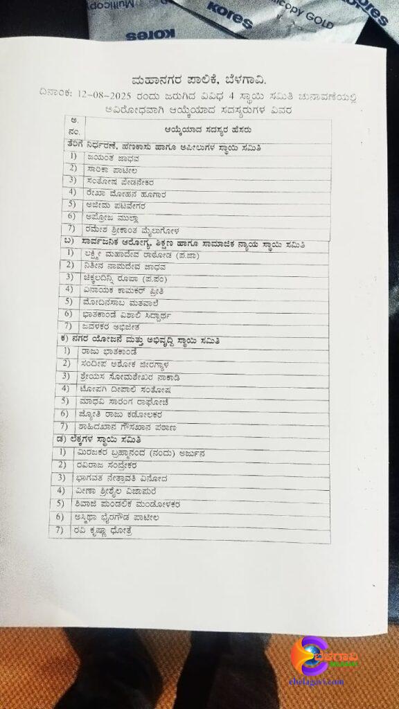ಮೂರು ಬಾರಿ ಮುಂದೂಡಲ್ಪಟ್ಟ ಬೆಳಗಾವಿ ಮಹಾನಗರ ಪಾಲಿಕೆಯ ನಾಲ್ಕು ಸ್ಥಾಯಿ ಸಮಿತಿಗೆ ಸದಸ್ಯರನ್ನು ಅವಿರೋಧವಾಗಿ ಆಯ್ಕೆ ಮಾಡಲಾಯಿತು.