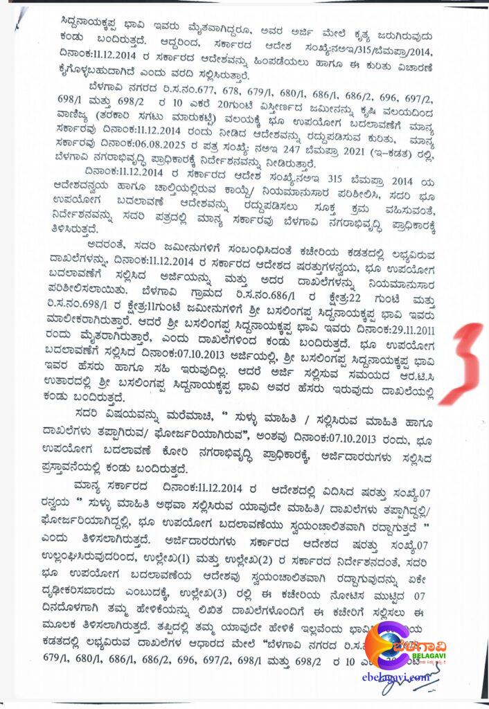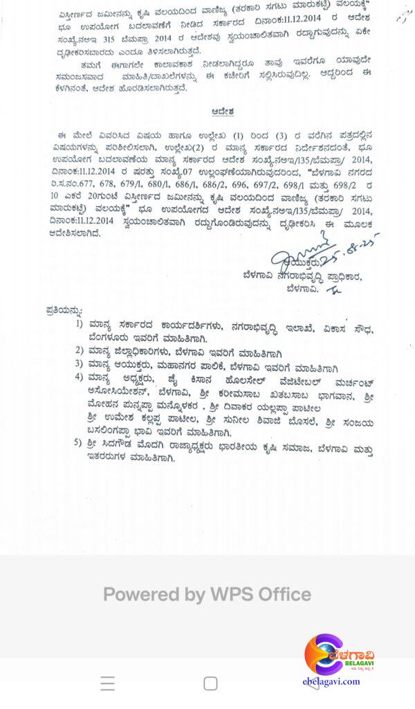 ಬೆಳಗಾವಿ ನಗರದ ಹೃದಯ ಭಾಗದಲ್ಲಿರುವ ರಿ.ಸ. ನಂ. ೬೭೭, ೬೭೮, ೬೭೯/೧, ೬೮೦/೧, ೬೮೬/೧, ೬೮೬/೨, ೬೯೬, ೬೯೭/೨, ೬೯೮/೧ ಮತ್ತು ೬೯೮/೨ ಸೇರಿ ಒಟ್ಟು ೧೦ ಎಕರೆ ೨೦ ಗುಂಟೆ ಜಮೀನುಗಳನ್ನು ಕೃಷಿ ವಲಯದಿಂದ ವಾಣಿಜ್ಯ (ತರಕಾರಿ ಸಗಟು ಮಾರುಕಟ್ಟೆ) ವಲಯಕ್ಕೆ ಪರಿವರ್ತನೆ ಮಾಡಿದ ಸರ್ಕಾರದ ೨೦೧೪ರ ಡಿಸೆಂಬರ್ ೧೧ರ ಆದೇಶವನ್ನು ಅಧಿಕೃತವಾಗಿ ರದ್ದುಗೊಳಿಸಲಾಗಿದೆ.
