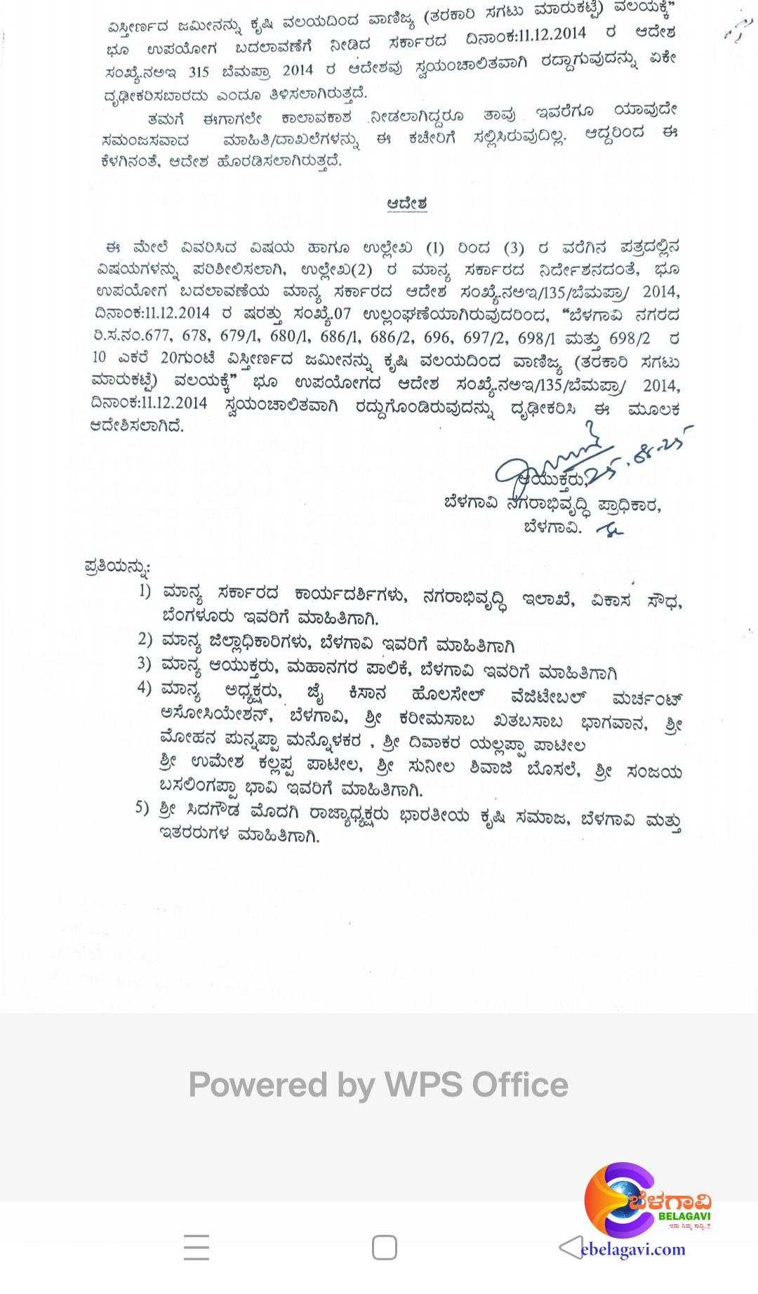 ಬೆಳಗಾವಿ ನಗರದ ಹೃದಯ ಭಾಗದಲ್ಲಿರುವ ರಿ.ಸ. ನಂ. ೬೭೭, ೬೭೮, ೬೭೯/೧, ೬೮೦/೧, ೬೮೬/೧, ೬೮೬/೨, ೬೯೬, ೬೯೭/೨, ೬೯೮/೧ ಮತ್ತು ೬೯೮/೨ ಸೇರಿ ಒಟ್ಟು ೧೦ ಎಕರೆ ೨೦ ಗುಂಟೆ ಜಮೀನುಗಳನ್ನು ಕೃಷಿ ವಲಯದಿಂದ ವಾಣಿಜ್ಯ (ತರಕಾರಿ ಸಗಟು ಮಾರುಕಟ್ಟೆ) ವಲಯಕ್ಕೆ ಪರಿವರ್ತನೆ ಮಾಡಿದ ಸರ್ಕಾರದ ೨೦೧೪ರ ಡಿಸೆಂಬರ್ ೧೧ರ ಆದೇಶವನ್ನು ಅಧಿಕೃತವಾಗಿ ರದ್ದುಗೊಳಿಸಲಾಗಿದೆ.