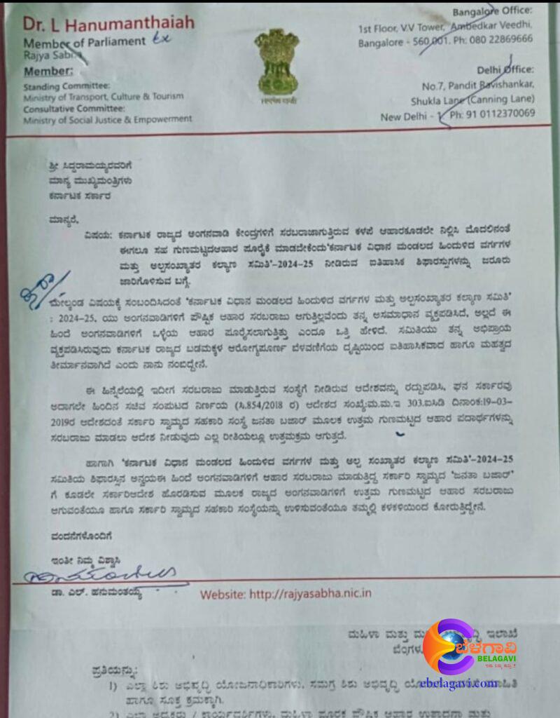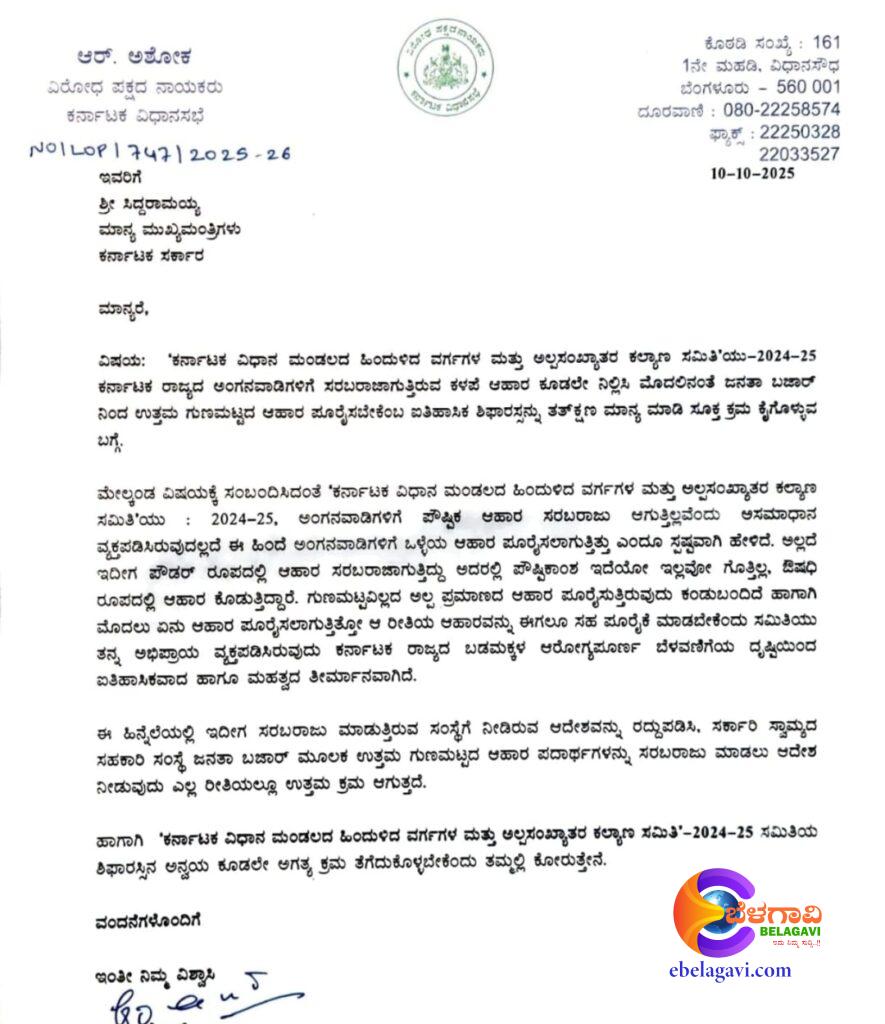 ರಾಜ್ಯಾದ್ಯಂತ ಅಂಗನವಾಡಿ ಕೇಂದ್ರಗಳಿಗೆ ಸರಬರಾಜಾಗುತ್ತಿರುವ ಆಹಾರವು ಗುಣಮಟ್ಟ ಕಳೆದುಕೊಂಡಿದ್ದು, ಇದು ಬಡ ಮಕ್ಕಳ ಆರೋಗ್ಯ ಮತ್ತು ಭವಿಷ್ಯಕ್ಕೆ ಭಾರಿ ಅಪಾಯ ತಂದೊಡ್ಡುತ್ತಿದೆ ಎಂದು ಆರೋಪಿಸಿ, ವಿಧಾನಸಭೆ ವಿರೋಧ ಪಕ್ಷದ ನಾಯಕ ಆರ್. ಅಶೋಕ್ ಹಾಗೂ ರಾಜ್ಯಸಭಾ ಸದಸ್ಯ ಡಾ. ಎಲ್. ಹನುಮಂತಯ್ಯ ಅವರು ಮುಖ್ಯಮಂತ್ರಿ ಸಿದ್ದರಾಮಯ್ಯ ಅವರಿಗೆ ತೀವ್ರ ಪದಗಳಲ್ಲಿ ಪ್ರತ್ಯೇಕ ಪತ್ರಗಳನ್ನು ಬರೆದಿದ್ದಾರೆ.