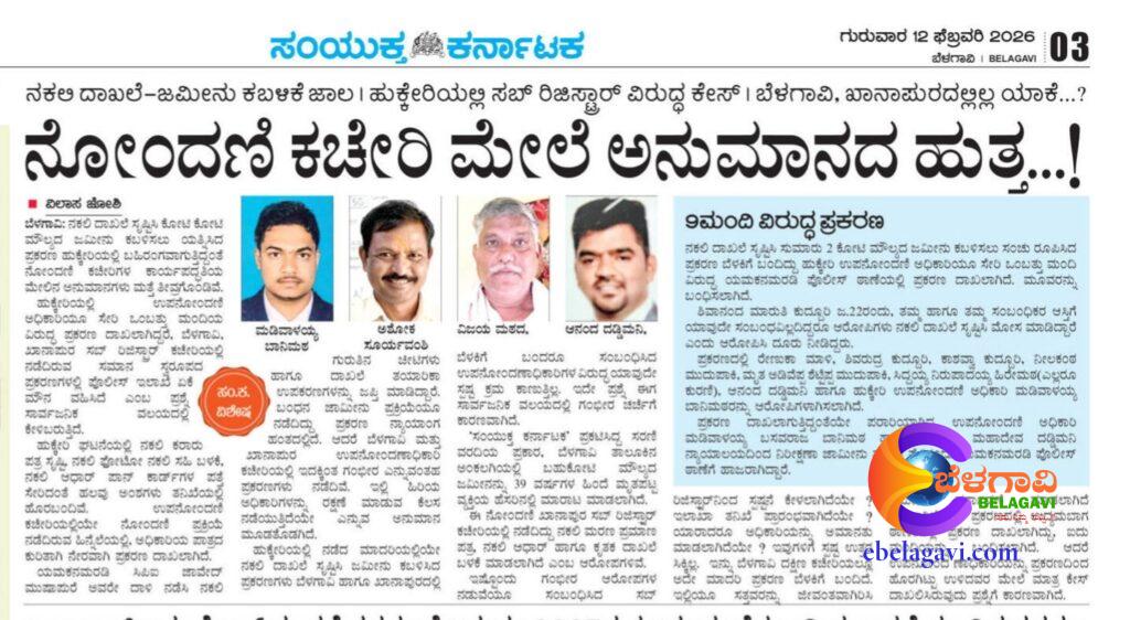 ಬೆಳಗಾವಿ: ನಕಲಿ ದಾಖಲೆಗಳನ್ನು ಸೃಷ್ಟಿಸಿ ಕೋಟಿ ಕೋಟಿ ಮೌಲ್ಯದ ಜಮೀನು ಕಬಳಿಸಲು ಯತ್ನಿಸಿದ ಪ್ರಕರಣ ಹುಕ್ಕೇರಿಯಲ್ಲಿ ಬಹಿರಂಗವಾದ ಹಿನ್ನೆಲೆಯಲ್ಲಿ, ನೋಂದಣಿ ಕಚೇರಿಗಳ ಕಾರ್ಯಪದ್ಧತಿಯ ಮೇಲಿನ ಅನುಮಾನಗಳು ಮತ್ತೆ ತೀವ್ರಗೊಂಡಿವೆ. ಹುಕ್ಕೇರಿಯಲ್ಲಿ ಉಪನೊಂದಣಿ ಅಧಿಕಾರಿಯೂ ಸೇರಿದಂತೆ ಒಂಬತ್ತು ಮಂದಿಯ ವಿರುದ್ಧ ಪ್ರಕರಣ ದಾಖಲಾಗಿದ್ದರೆ, ಬೆಳಗಾವಿ, ಖಾನಾಪುರ ತಾಲೂಕಿನಲ್ಲಿ ಕೇಳಿಬಂದಿರುವ ಸಮಾನ ಸ್ವರೂಪದ ಆರೋಪಗಳ ಬಗ್ಗೆ ಇನ್ನೂ ಸ್ಪಷ್ಟ ಕಾನೂನು ಕ್ರಮ ಕೈಗೊಳ್ಳದಿರುವುದು ಸಾರ್ವಜನಿಕ ವಲಯದಲ್ಲಿ ಪ್ರಶ್ನೆಗೆ ಕಾರಣವಾಗಿದೆ.