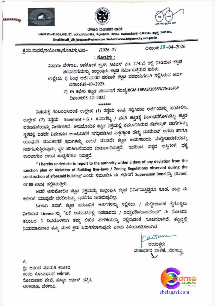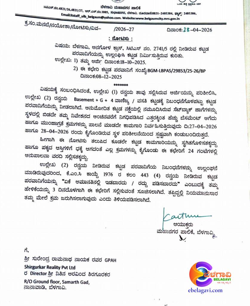 ಮಂಜೂರಾದ ಕಟ್ಟಡ ಪರವಾನಿಗೆ ಹಾಗೂ ಅನುಮೋದಿತ ನಕ್ಷೆ ಮೀರಿ ಕಾಮಗಾರಿ ನಡೆದಿದೆಯೆಂಬ ಆರೋಪದ ಹಿನ್ನೆಲೆಯಲ್ಲಿ ಬೆಳಗಾವಿ ಮಹಾನಗರ ಪಾಲಿಕೆ ಕಟ್ಟಡ ಮಾಲೀಕರು ಮತ್ತು ತಾಂತ್ರಿಕ ಮೇಲ್ವಿಚಾರಕರಿಗೆ ಪ್ರತ್ಯೇಕ ನೋಟಿಸ್ ಜಾರಿ ಮಾಡಿದೆ.